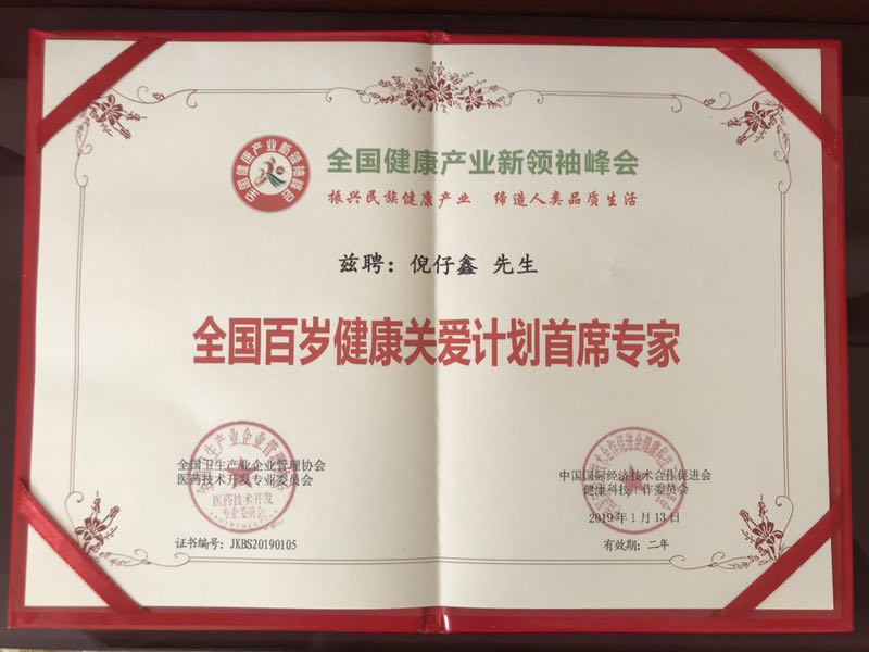 倪仔鑫董事長(zhǎng)榮獲“全國(guó)百歲健康關(guān)愛計(jì)劃首席專家”