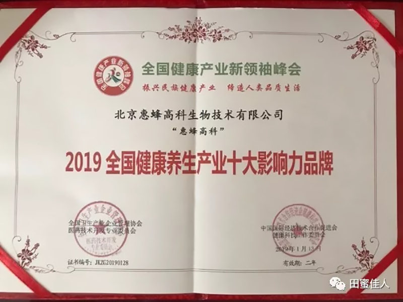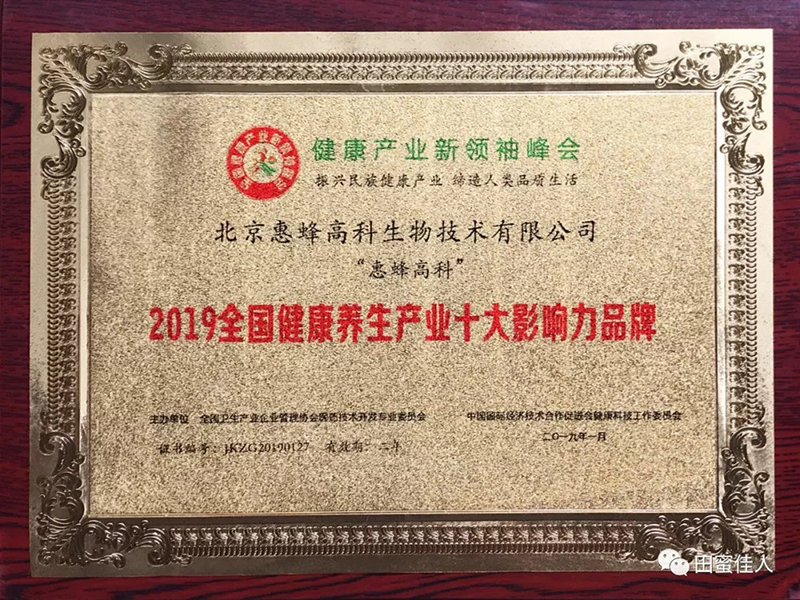 北京惠蜂高科生物技術(shù)有限公司榮獲“2019全國(guó)健康養(yǎng)生產(chǎn)業(yè)十大影響力品牌”