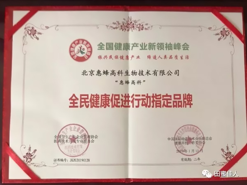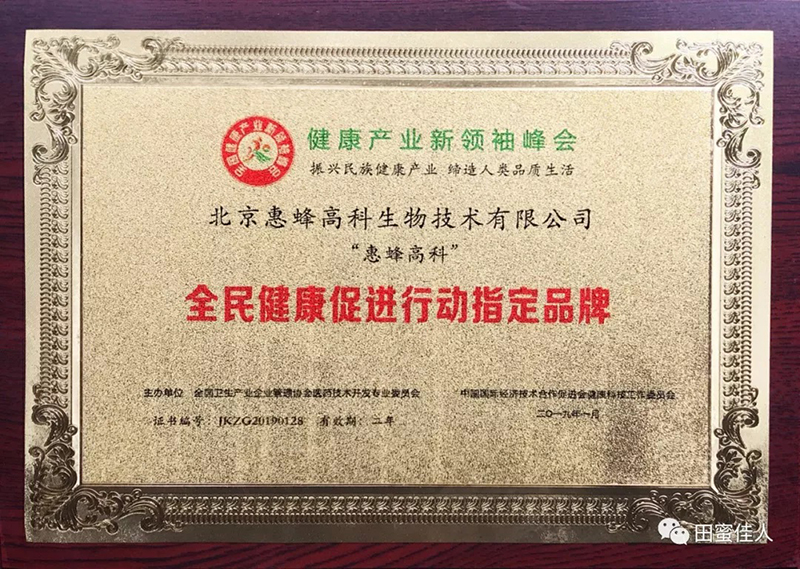 北京惠蜂高科生物技術(shù)有限公司榮獲“全民健康促進(jìn)行動(dòng)指定品牌”